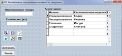 Завершающей формой будет четвертая форма (Form4), которая будет формировать ИС Автоматизация планирования накладной на продукцию (рис.24). Ознакомившись с продукцией производителя, заказчик сможет сделать заказ, для этого клиент, ориентируясь на таблицу Ассортимента, введет Наименование необходимой продукции и Количество. Данные заказа автоматически передадутся в текстовый документ более удобный для печати.