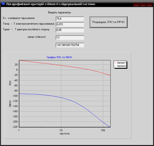 Дано характеристику слідкувальної системи, обґрунтовано вимоги до якості і точності управління. Розроблено функціональну, структурну схеми, математичну модель, розраховано параметри системи. На основі цих даних розроблено алгоритм та написано програму для побудови ЛАХ та ЛФЧХ на мові програмування високого рівня C++ в середовищі C++ Builder 6. Виконано дослідження якості перехідних процесів при одиничній вхідній дії і стійкості.