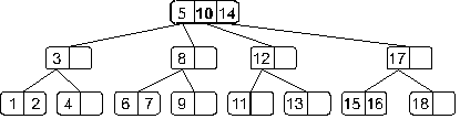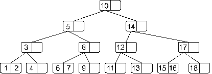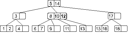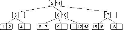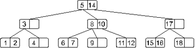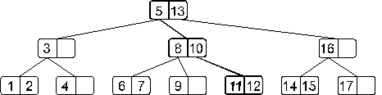 Поскольку дерево упорядочено, то Items[1].Value Само дерево можно задать просто указанием корневой вершины. Естественно, что у такой вершины PreviousNode будет равен nil. Type TBTree = TBTreeNode; Прежде чем рассматривать алгоритмы, соберем воедино все требования к B-дереву: каждый узел имеет не более NumberOfItems сыновей; каждый узел, кроме корня, имеет не менее NumberOfItems/2 сыновей; корень, если он не лист, имеет не менее 2-х сыновей; все листья расположены на одном уровне (дерево сбалансировано); нелистовой узел с k сыновьями содержит не менее k-1 ключ. Из всего вышесказанного можно сразу сформулировать алгоритм поиска элемента в B-дереве. Поиск элемента в B-дереве Поиск будем начинать с корневого узла. Если искомый элемент присутствует в загруженной странице поиска, то завершаем поиск с положительным ответом, иначе загружаем следующую страницу поиска, и так до тех пор, когда либо найдем искомый элемент, либо не окажется «следующей страницы поиска» (пришли в лист B-дерева). Посмотрим на примере, как это будет работать. Пусть мы имеем такое дерево (в наших примерах мы будем разбирать небольшие деревья, хотя в реальности B-деревья применяются при работе с большими массивами информации): Будем искать элемент 11. Сначала загрузим корневой узел. Эта страница поиска содержит элементы 5 и 13. Наш искомый элемент больше 5, но меньше 13. Значит, идем по ссылке, идущей от элемента 5. Загружаем следующую страницу поиска (с элементами 8 и 10). Эта страница тоже не содержит искомого элемента. Замечаем, что 11 больше 10 – следовательно, двигаемся по ссылке, идущей от элемента 10. Загружаем соответствующую страницу поиска (с элементами 11 и 12), в которой и находим искомый элемент. Итак, в этом примере, чтобы найти элемент, нам понадобилось три раза обратиться к внешней памяти для чтения очередной страницы. Если бы в нашем примере мы искали, допустим, элемент 18, то, просмотрев 3 страницы поиска (последней была бы страница с элементом 17), мы бы обнаружили, что от элемента 17 нет ссылки на поддерево с элементами большими 17, и пришли бы к выводу, что элемента 18 в дереве нет. Теперь точно сформулируем алгоритм поиска элемента Item в B-дереве, предположив, что дерево хранится в переменной BTree, а функция LookFor возвращает номер первого большего или равного элемента узла (фактически производит поиск в узле). function BTree.Exist(Item: ItemType): Boolean; Var CurrentNode: PBTreeNode; Position: Integer; begin Exist := False; CurrentNode := @BTree; Repeat Position := LookFor(CurrentNode, Item); if (CurrentNode.Count>=Position)and (CurrentNode.Items[Position].Value=Item) then begin Exist := True; Exit; end; if CurrentNode.Items[Position-1].NextNode=nil then Break else CurrentNode := CurrentNode.Items[Position-1].NextNode; until False; end; Здесь мы пользуемся тем, что, если ключ лежит между Items[i].Value и Items[i+1].Value, то во внутреннюю память надо подкачать страницу поиска, на которую указывает Items[i].NextNode. Заметим, что для ускорения поиска ключа внутри страницы поиска (функция LookFor), можно воспользоваться дихотомическим поиском, который описан ранее в главе, где разбирались способы хранения множества элементов в последовательном массиве. Учитывая то, что время обработки страницы поиска есть величина постоянная, пропорциональная размеру страницы, сложность алгоритма поиска в B-дереве будет T(h), где h – глубина дерева. Добавление элемента в B-дерево Для того чтобы наше дерево можно было считать эффективной структурой данных для хранения множества значений, необходимо, чтобы каждый узел заполнился хотя бы наполовину. Дерево стр