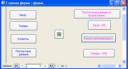 Данная форма является стартовой. С нее открываются формы “ЗАКАЗ”, “КЛИЕНТ”, “ТОВАРЫ ”, “ПАСПОРТНЫЕ ДАННЫЕ ”.