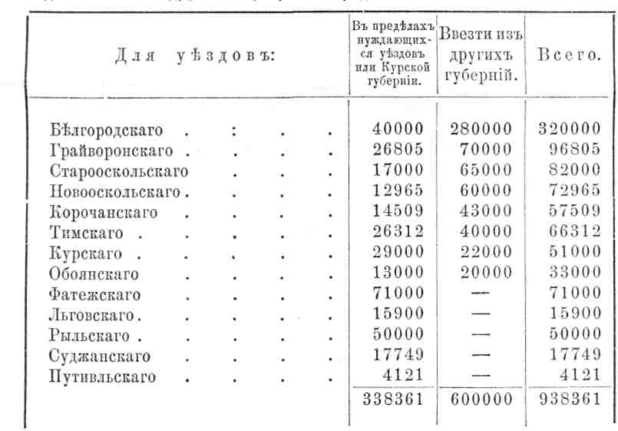 Как известно, по распоряжению министерства внутренних дел, заготовка хлеба вне пределов губернии в 1893г. была возложена на особых уполномоченных министерства, каковыми для Курской губернии были назначены: генерал-лейтенант Толстой и член совета министра внутренних дел тайный советник Звегинцев. Еще в декабре минувшего года губернскою управою, на основании доставленных уездными управами сведений, была сделана роспись количества хлеба, какое может быть куплено в пределах нуждающихся уездов Курской губернии и ввезено для продовольственных надобностей из других губерний. Предполагалось заготовить: