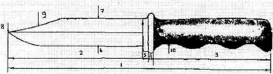 1 – длинна ножа; 2 – длинна клинка; 3 – длинна рукояти; 4 – ограничитель; 5 – пята; 6 – лезвие; 7 – обух; 8 – боевое острие; 9 – скос обуха; 10 – подпальцевые выемки.
