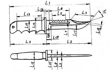 L1 – общая длинна ножа; L2 – максимальная длинна клинка; L3 – максимальная длинна рукояти; L4 – длинна скоса обуха (по хорде); L5 – длинна пилы обуха; L6 – длинна дола; L7 – ширина дола максимальная; L8 – глубина дола максимальная; L9 – толщина обуха (клинка) максимальная; L10 – глубина пальцевых выемок (каждой в отдельности); L11 – ширина рукояти в средней части; L12 – толщина рукояти в средней части; L13 – длинна черена; L14 – длинна крестовины; L15 – ширина крестовины; L16 – толщина крестовины; L17 – ширина заточки лезвия максимальная; L18 – ширина заточки скоса обуха максимальная; L19 – длинна пяты.