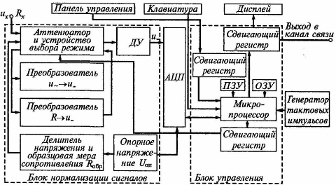 Блок нормализации сигналов с помощью соответствующих преобразователей приводит входные измеряемые параметры (напряжения переменного и постоянного тока, сопротивления постоянному току и пр.) к унифицированному сигналу (и=), который подается на вход АЦП. Последний действует обычно по методу двойного интегрирования. Блок управления обеспечивает выбор режима работы для заданного вида измерений, управление АЦП, дисплеем. Кроме того, он создает нужную конфигурацию системы измерения.