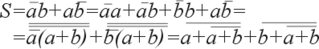 Простейшим двоичным суммирующим элементом является четвертьсумматор. Происхождение названия этого элемента следует из того, что он имеет в два раза меньше выходов и в два раза меньше строк в таблице истинности по сравнению с полным двоичным одноразрядным сумматором. Наиболее известны для данной схемы названия: элемент “сумма по модулю 2” и элемент “исключающее ИЛИ”. Схема (рис. 4) имеет два входа а и b для двух слагаемых и один выход S для суммы. Работу её отражает таблица истинности 1 (табл. 2), а соответствующее уравнение имеет вид