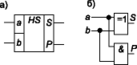 Полусумматор (рис. 6) имеет два входа a и b для двух слагаемых и два выхода: S — сумма, P — перенос. Обозначением полусумматора служат буквы HS (half sum — полусумма). Работу его отражает таблица истинности 2 (табл. 3), а соответствующие уравнения имеют вид: