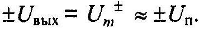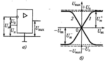Передаточные характеристики (рис.12, б) имеют важнейшее значение для ОУ. Если усиливаемый сигнал подан на неинвертирующий вход, а инвертирующий вход заземлен, то знак выходного напряжения совпадает со знаком входного напряжения (линия 1). При подаче сигнала на инвертирующий вход и заземлении неинвертирующего, знак выходного напряжения будет противоположен знаку входного (линия 2). Угол наклона линейных участков передаточных характеристик пропорционален коэффициенту усиления по напряжению К0. Горизонтальные участки передаточных характеристик соответствуют режиму насыщения оконечных транзисторов ОУ, поэтому выходное напряжение