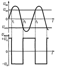 Пусть в момент времени t = 0 напряжение на выходе компаратора Uвых = Um+. В таком состоянии компаратор будет находиться, пока амплитуда входного напряжения UBX < Uср. В момент времени t = tt входное напряжение станет UBX = Uср, и компаратор переключится. При этом выходное напряжение Uвых скачком изменится со значения Um+ на значение Um-. В момент времени t = t2 входное напряжение станет равным Uотп, и произойдет повое переключение компаратора.