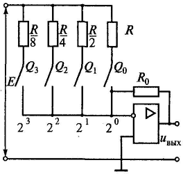 Принцип действия четырехразрядного цифроаналогового преобразователя иллюстрируется с помощью простейшей схемы на ОУ, представленной на рис. 16. Основу схемы составляет матрица резисторов с источником постоянного напряжения, соединенных с инвертирующим входом ОУ ключами, которые управляются двоичным кодом (например, выходным кодом счетчика).