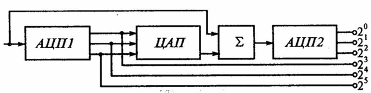 Аналого-цифровой преобразователь формирует из входного напряжения три старших разряда выходного кода, соответствующие значениям 23, 24, и 25. Эти разряды поступают на вход трехразрядного ЦАП, в котором они вновь преобразуются в аналоговое напряжение, отличающееся от входного напряжения uвх на величину погрешности преобразования схемы АЦП1. Аналоговое напряжение с выхода схемы ЦАП подается на сумматор ∑, где оно вычитается из входного напряжения uвх. Полученное разностное напряжение подается на АЦП2, в котором оно преобразуется в три младших цифровых разряда22, 21, 2° выходного кода преобразователя.