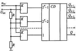 Действие параллельных (по методу считывания) k-разрядных АЦП основано на использовании 2k-1 компараторов (рис.18). Неинвертирующие входы операционных усилителей компараторов объединены, и на них подается непрерывный сигнал, а к каждому инвертирующему входу подключено индивидуальное опорное напряжение, снимаемое с резистивного делителя. Разность между опорным напряжением двух соседних компараторов равна шагу квантования ∆ = U0п / 2k. Компараторы, у которых входное напряжение превысит соответствующее опорное напряжение, вырабатывают логическую 1, а остальные - логический 0. Информация с выходов компараторов поступает на шифратор CD, который преобразует ее в двоичный код.