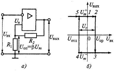 На инвертирующий вход ОУ поступает входное напряжение, а на неинвертирующий вход подается опорное напряжение Uн= Uon = βUm, снимаемое с делителя R1,R2. Таким образом, ОУ охвачен положительной обратной связью по неинвертирующему входу, и выходное напряжение скачком изменяет свою полярность при сравнении входного и опорного напряжений.