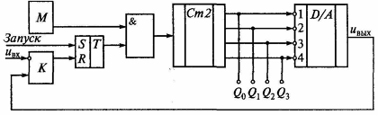 Начало преобразования входного непрерывного сигнала определяется временем поступления импульса запуска, который через.RS-триггер Т подключает счетчик Ст2 к выходу генератора тактовых (счетных) импульсов М. Схема ЦАП D/A, куда поступает цифровой код со счетчика, формирует выходное напряжение uвых, которое сравнивается в компараторе К с входным напряжением uвх. При сравнении этих напряжений, компаратор через логический элемент И (&) выдает сигнал прекращения подачи на счетчик Ст2 тактовых импульсов. В результате осуществляется считывание со счетчика выходного четырехразрядного кода, представляющего в момент окончания преобразования цифровой эквивалент выходного напряжения.