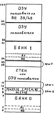 Блок оперативных регистров включает в себя ОЗУ, таймер-счетчик, регистр состояния программы, схему прерывания и регистр дополнительных флажков. Оперативное запоминающее устройство имеет объем либо в 64 байта (BE 35/48), либо 128 байт (BE 39/49). Назначение отдельных ячеек ОЗУ изображено на рис. 24