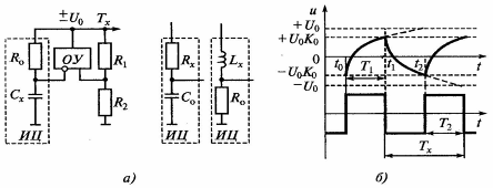 Измерительная цепь (ИЦ) интегрирующего типа с постоянной времени tx = R0CX (или RxCо, или Lx/Rо)) питается напряжением с выхода операционного усилителя (ОУ), являющегося компаратором (устройством сравнения). Порог его срабатывания задается резистивным делителем Rt и R2 (коэффициентом передачи цепи положительной обратной связи). Временные диаграммы работы преобразователя параметров приведены на рис 27.б.