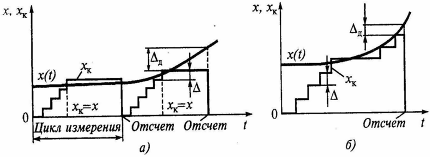 При идентичности величин хк = х процесс уравновешивания прекращается и фиксируется результат измерения, равный числу ступеней квантования компенсирующей величины. Отсчет показаний обычно производится в конце цикла изменения величины хк. При этом возникает динамическая погрешность ∆д, обусловленная изменением измеряемой величины x(t) за интервал времени между моментами уравновешивания и отсчета.