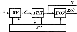 В цифровом приборе измеряемая величина х подается на входное устройство (ВУ), предназначенное для выделения ее из помех и масштабного преобразования. Аналого- цифровой преобразователь (АЦП) преобразует величину х' в код N, который подается на цифровое отсчетное устройство (ЦОУ), где индицируется в виде ряда цифр. Цифровые коды могут выводиться и во внешние устройства, например в компьютер для дальнейшей обработки или хранения. Управляет работой ЦИП устройство управления: (УУ) путем выработки и подачи определенной последовательности командных сигналов во все функциональные узлы прибора.