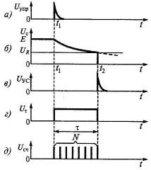 ис. 34.Временные диаграммы к схеме рис.33: а- импульсы управления; б- процесс разряда конденсатора; в- сигнал на выходе УС; г- сигнал триггера; д- импульсы на входе счетчика.