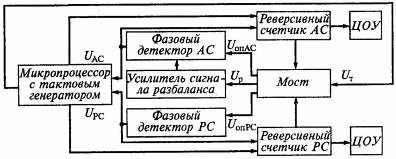 Микропроцессор со встроенным тактовым генератором определенной частоты выполняет все функции управления измерительным процессом. Напряжение разбаланса моста Up через усилитель сигнала разбаланса поступает на входы фазовых детекторов активной АС и реактивной PC составляющих. Опорные напряжения фазовых детекторов UопАС и UonPc снимаются с мостовой схемы. Напряжение разбаланса с фазовых детекторов подается на реверсивные счетчики, управляющие состоянием органов уравновешивания мостовой схемы, и на микропроцессор, задающий сигналами UAC и UPC скорость счета соответствующих реверсивных счетчиков.