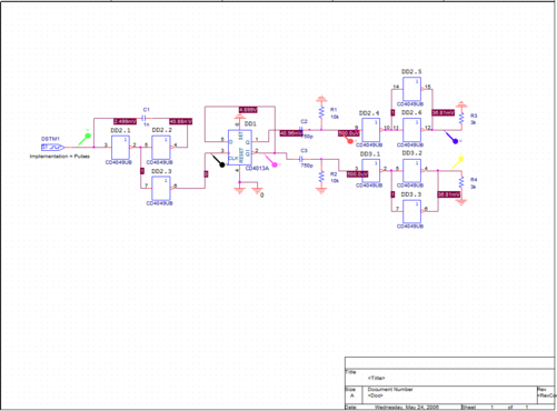 С дифференцирующей цепочки сигнал поступает на вход импульсного усилителя – формирователя импульсов малой длительности (порядка 10 мкс), построенного на элементах DD2-DD6. На рисунке 2 данный сигнал показан синим цветом.