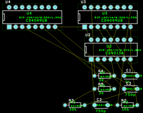 Установленные элементы соединяются согласно схеме электрической принципиальной проводниками по команде Place / Wire. Начало ввода цепи отмечается щелчком ЛКМ. Цепь прокладывается движением курсора. Каждый излом фиксируется щелчком ЛКМ. Ввод цепи завершился, если ее конец совпадает с выводом компонента или любой точкой другой цепи. Если Вы не попали курсором на вывод компонента, то появляется предупреждение в виде восклицательного знака. Если при этом завершить проведение цепи, то соединения не будет. Режим ввода цепи завершается нажатием клавиши ESC или выбором команды End Wire в контекстном меню, открываемом щелчком ПКМ.