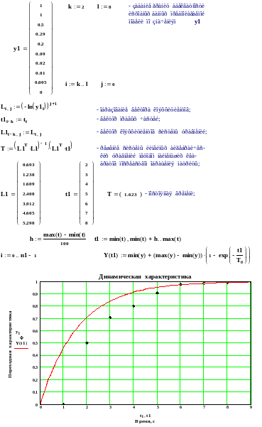Динамическая модель объекта первого порядка без запаздывания является наименее точной, поэтому ее применение не целесообразно при моделировании динамики объекта. Ниже приведен проверочный расчет динамической модели объекта первого порядка без запаздыванием и модели второго порядка без запаздыванием на ЭВМ в системе MathCad.