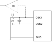 Найбільш стабільну роботу RC-генератора забезпечує кварцовий резонатор, який підключається до виводів OSC1 та OSC2 як показано на рис.3.4. Ці виводи є відповідно входом і виходом тактового генератора.