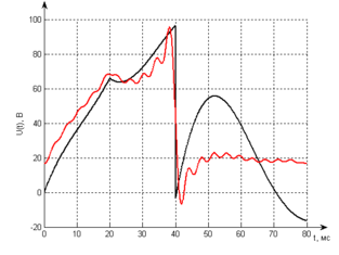 Решение, полученное при помощи комплексной передаточной функции по напряжению и разложения входного сигнал в тригонометрический ряд Фурье