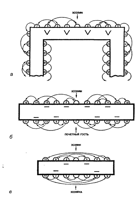 банкета. На схемах обозначены: цифрами — места участников банкета; горизонтальными черточками — места женщин; уголком — места гостей хозяина; а — за столом присутствуют только мужчины, их обслуживают несколько официантов; б—за столом присутствуют мужчины и женщины, их обслуживают четыре официанта; в — за столом присутствуют мужчины и женщины, их обслуживают два официанта