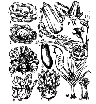 1 — кочанная капуста; 2 — савойская капуста; 3 — брюссельская капуста; 4 — цветная капуста; 5 — кабачки; 6 — баклажаны; 7 — кольраби; 8 — сладкий перец (паприка); 9 — патиссоны; 10 — лук-порей