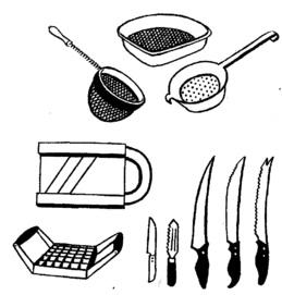 Рис. 3. Вверху — различные сита для мытья овощей, внизу — ножи для резки овощей