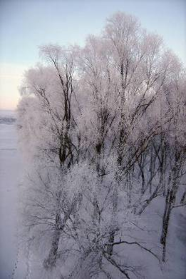 На рис. 17 изображены деревья. Цель − показать заснеженные деревья. Для получения фотографии использовался фотоаппарат Canon 450D. Деревья были сфотографированы в солнечный день при помощи заднедиагонального освещения. На переднем плане показаны два дерева, благодаря которым кадр выглядит симметричным. Голубое небо с бледно-розовым переходом делает кадр выразительным. Для подчеркивания белизны и густоты инея на ветвях деревьев применялся оранжевый светофильтр. Съемка проводилась издалека при помощи зума. Для диафрагмы установил значение 5.6, выдержка 1/250. Ветви деревьев прорисованы четко, имеют снежный вид.