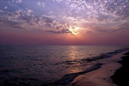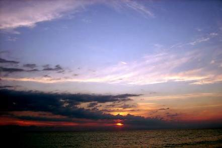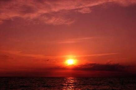 Алый тон заката может сказать: скоро уйдет солнце за горизонт и наступит ночь. Фотосъемка данного пейзажа проводилась на открытом воздухе в вечернее время. Фотография была сделана на фотоаппарате Canon 450D. Применялся красный светофильтр. Для диафрагмы установил значение 8, выдержка 1/1000. Фотография имеет хорошее качество. Море на фотографии темного почти черного цвета. Солнце лежит чуть выше уровня моря, также на снимке много облаков, что придает фотографии красочный вид. Кадр уравновешен правильно. Задуманная цель удачно выполнена.