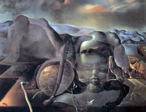 «Бесконечная загадка ». Дали верен своему принципу умножения образов, расчленяя их на производящих "отцов" и творимых "детей". Такой вегетации бездумно предаются все: распростёртый философ, лицо циклопа, собака, мандолина, мифологическое животное, лапа которого ещё остаётся в поле нашего зрения. Но есть ещё лицо, окрашенное в тёмные, оплывающие тона. Своей параноической пульсацией оно подаёт сигналы опасности, выражает чувство коллективного страха. В комментариях к картине Дали явно выделяет несколько разных образов – «берег около мыса Креус с женщиной сзади, которая ремонтирует парус, и лодкой (возможно, намек на знакомую рыбачку Лидию)», «лежащий философ», «Лицо великого одноглазого кретина (появление лица Лорки, также признак одного из символов – оглупленные лица Дали и сестры)», «серая гончая», «мандолина, ваза с персиками и две груши (груши ранее появлялись в одном из натюрмортов, посвященном Лорке)», и «мифологическое животное» - которые в результате и собираются в картину».
