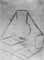 3 – Конструктивный анализ формы и её перспективное построение. Когда найдено место в листе каждому предмету натюрморта, чётче прорисовывается каждый предмет, принимая во внимание то, что каждый предмет несёт в себе основу какой-то геометрической формы. Рисунок делается с учётом перспективы.