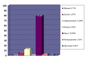 Було проведено дослідження та аналіз українських військових команд на лексико-граматичному рівні. Завдяки цьому підраховано загальну кількість команд, а саме – 276 ± 3%, класифіковано команди за типами спонукання (вітання, дозвіл, інформування, клятва, наказ, попередження, прохання), підраховано відсоткове відношення видів спонукання до загальної кількості команд (див. діаграмму 1), описано вплив функцій спонукання кожної групи військових команд.