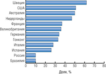 По процентному соотношению наибольшее число пользователей Интернета в Швеции, где 62% жителей регулярно обращаются в Интернет.