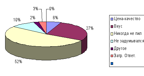Причиной отказа от употребления пива Завода «ТАПИ» является неудовлетворенность его вкусом (00%). Особенно это пиво не нравится мужчинам, людям в возрасте от 00 до 00 и старше 00 лет, лицам с доходом свыше 0000 рублей. Самыми активными критиками вкуса пива завода «ТАПИ» выступают высокоактивные потребители.