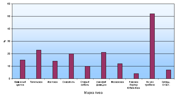 Все эти марки (кроме «Темного») чаще других категорий респондентов пьют мужчины, люди старше 00 лет, лица со средним образованием, респонденты с доходом ниже 0000 рублей (см. Таблицу 0.0).