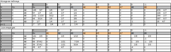 Весь процесс решения задачи приведен в табл. 3.2.1, которая состоит из 2 частей, отвечающих 0-й (исходная таблица) и 1-й итерациям.