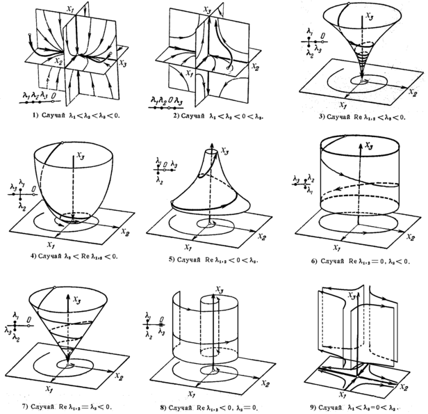 Рассмотрим теперь некоторые положения равновесия в трехмерном пространстве. Характеристическое уравнение — кубическое с вещественными коэффициентами, оно может иметь три вещественных или один вещественный и два комплексно-сопряженных корня. В зависимости от расположения этих корней