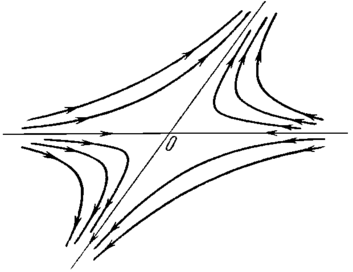 ). В этом случае одна из траекторий всегда будет неограниченно возрастать, а другая неограниченно уменьшаться. Таким образом, седло всегда неустойчиво.