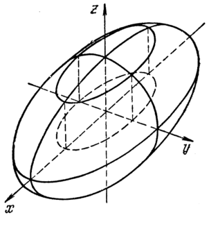 Представление об эллипсоиде можно получить следующим образом. Рассмотрим на плоскости Оху семейство эллипсов (23) (рис. 1), полуоси а* и b* которых зависят от h (см. (22)), и каждый такой эллипс снабдим отметкой h, указывающей, на какую высоту по оси Оz должен быть «поднят» этот эллипс. Мы получим своего рода «карту» эллипсоида. Используя эту «карту», легко представить себе пространственный вид эллипсоида.