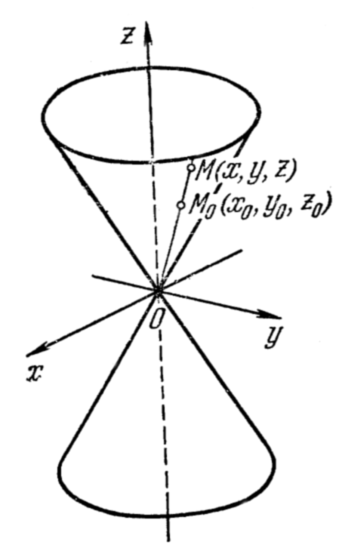 М0(х0, у0, z0) конуса (6) и начало координат О , целиком располагается на конусе, т. е. координаты (х, у, z) любой точки М прямой L удовлетворяют уравнению (6).