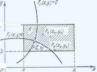 Теорема. Пусть в некоторой замкнутой окрестности R {axA; byB}(рис.) имеется одна и только одна пара корней x= и y= системы (2). Если:1) функции 1(x,y) и 2(x,y) определены и непрерывно дифференцируемы в R; 2) начальные приближения x0, y0 и все последующие приближения xn, yn (n=1,2...) принадлежат R; 3) в R выполнены неравенства