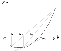 Процесс построения последовательности вложенных стягивающих отрезков методом вилки (дихотомии) является эффективным вычислительным алгоритмом решения уравнения f(x)=0. На n-ом шаге процесса получаем: