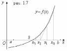 | (c1)| Отсюда следует, что: |2| Точно так же получаем, что: |3|=| (c1)|·|2| и вообще: |n+ 1|=qn·|1| Тем самым наше утверждение доказано. Так само при 0 Точно так же можно доказать, что если на отрезке [a, b] выполнено неравенство: | (x)|>1, то процесс итераций расходится. Особенно быстро сходится процесс последовательных приближений, если в точке производная функции (x) обращается в нуль. В этом случае по мере приближения к , значение (x) стремится к нулю. Так как: |n+ 1|=| (cn)|·|n| то сходимость процесса ускоряется по мере приближения к точке . Однако то же самое можно наблюдать в методе Ньютона, при замене f(x)=0 на 5. Метод касательных (метод Ньютона) Метод касательных, связанный с именем И. Ньютона, является одним из наиболее эффективных численных методов решения уравнений. Идея метода очень проста. Возьмём производную точку x0 и запишем в ней уравнение касательной к графику функции f(x): y=f(x0)+ f (x) (x-x0) (1.5) Графики функции f(x) и её касательной близки около точки касания, поэтому естественно ожидать, что точка x1 пересечения касательной с осью Ox будет расположена недалеко от корня c (рис. 1.5) Для определения точки имеем уравнение: f(x0)+ f (x0) (x1-x0)=0 таким образом: x1=x0 – f (x0)/ f (x0) (2.5) Повторим проделанную процедуру: напишем уравнение касательной к графику функции f(x) при x=x1 и найдём для неё точку пересечения x2 с осью Ox (см. рис.1.5) x2=x1 – f (x1)/ f (x1). Продолжая этот процесс, получим последовательность {xn}, определён- ную с помощью рекуррентной формулы: xn+ 1=xn – f (xn)/ f (xn), n=0, 1, 2, … (3.5) рис. 1.5 Построение последовательности {xn}по методу касательных При исследовании этой последовательности, как и последовательности метода итераций, встают два вопроса: Можно ли процесс вычисления чисел xn продолжать неограниченно, т. е. будут ли числа xn принадлежать отрезку [a, b] ? Если процесс (3.5) бесконечен, то как ведёт себя последовательность {xn} при n ? При анализе этих вопросов предположим, что корень x=c является внутренней точкой отрезка [a, b] (a | f (x)|m>0, | f (x)|M, x[a, b], (4.5) и докажем следующую теорему. Теорема о сходимости метода касательных. Если функция f(x) удовлетворяет условиям, сформулированным п.1., то найдётся такое : 0 Доказательство. В силу предположения о дифференцируемости функции f(x) и не равенстве нулю её производной f (x) уравнение f(x)=0 эквивалентно на отрезке [a, b] уравне- нию: x=(x), (x)=x– f (x)/ f (x) (5.5) так что корень x=c исходного уравнения является одновременно корнем уравнения (5.4). Исследуем возможность отыскания этого корня с помощью итераций. Вычислим производную функции (x): и оценим полученное выражение. Согласно неравенствам (4.5): Для дальнейшей оценки | Положим =m2/(2M) Тогда в силу (8.5) для данного можно указать такое : 0< min (c–a, b–c), что для всех Учитывая это, получим: Таким образом, функция (x) удовлетворяет на отрезке [c-, c+] [a, b] условию Липшица с постоянной =0.5<1. Это означает, что уравнение (5.5) можно решать методом итераций: при любом выборе нулевого приближения x0 на отрезке [c-, c+] существует бесконечная последовательность {xn}, xn+1=(xn), n=0, 1, 2, …, сходящаяся к корню x=c. Теперь нам остаётся заметить, что итерационной последовательностью для уравнения (5.5), сходимость которой мы только что установили, является последовательность (3.5) метода касательных. Теорема доказана. Требование близости нулевого приближения x0 к искомому корню c является существенным для метода касательных. На рис.2.5 изображён график, где х0 выбрано неправильно, то есть р