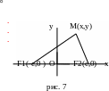 . Введем на плоскости декартову систему координат, приняв за ось Ох прямую (F1F2), а за ось Оу – прямую, проходящую через середину О отрезка
