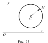 ешение. Обозначим, буквой М переменную точку, буквами х, у — ее координаты (т. е. текущие координаты). Данная окружность есть геометрическое место точек, каждая из которых отстоит от точки С на расстоянии r; таким образом, точка М находится на данной окружности в том и только в том случае, когдаСМ = r. (1)