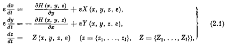 Асимптотические формулы для решения этой системы находятся для области, где траектории соответствующей гамильтоновой системы «быстрых движений» при каждом векторе z замкнуты (в случае невырожденного центра в рассматриваемую область включается и сам центр). Метод исследования системы (1.3) таков: сначала рассматривается система «быстрых движений» (1.4), а затем система (1.3) после соответствующей замены переменных усредняется вдоль решений (1.4). Оказывается, что уравнение с малым параметром и. при старшей производной и с пропущенной в основном члене Q (п — 1)-й производной, исследованное В.М. Волосовым (при п — 2 — в работе (12Г), при F ~ О — в 'работах (8) — (п)) методом конечных разностей, является частным случаем системы (1.3). Поэтому результаты работ (8) — (12) (эти результаты сформулированы в § 3 настоящей работы) следуют из результатов § 2.